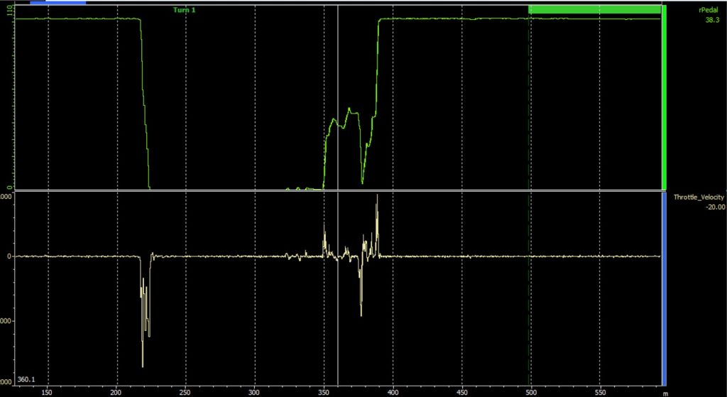 Unless a driver is going from throttle to the brake, shifting a manual car, or lifting for a high speed corner instead of braking, lifting should be a red flag. If a driver has gotten to the apex of the corner and goes to throttle and then lifts then that means that something just happened that the driver didn’t like – either consciously or subconsciously. Many times this means that the car is understeering and that lift transferred weight to the front tires in order to give them a little more grip. It could also mean that the driver did not take the correct line into the corner and paid for it by having to lift while exiting. Or it could mean that the driver simply tried to go to throttle too soon – but again, there is a reason for the lift and it is important to identify the reason. This is something that is easily identified in the data so don’t ignore it. Exhibit 1 shows an example of a driver lifting after the initial throttle application exiting a corner.